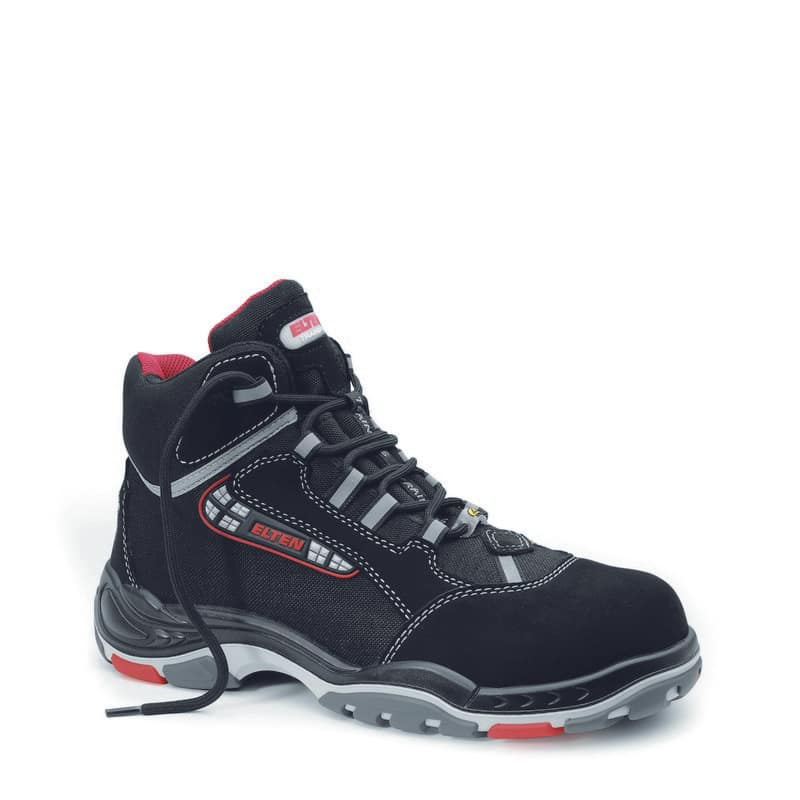 Elten Sander veiligheidsschoen. Sportief en modern design. Superlicht. Metaal- en ledervrij. Gehydrofobeerd microvezel Fashmo met contrastdelen in Cordura. Ademende en zachte textielbinnenvoering. Gepolsterde watertong. ESD inlegzool. ESD-veilig. TPU/PU-zool. Hoog model. Kunststof neus en metaalvrije zool.