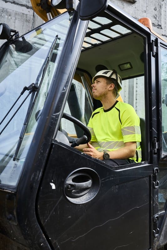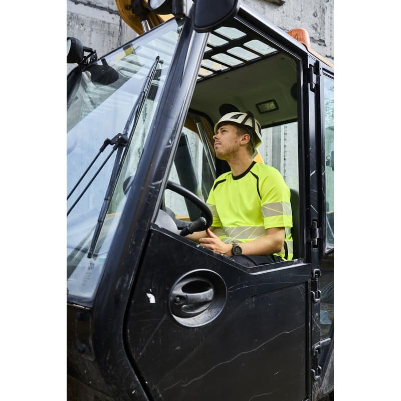 Premium. Fluorescerend, met schuine reflectie. Tweekleurig. Moderne pasvorm. Comfortabel katoen aan de binnenkant en duurzaam polyester met stretch aan de buitenkant. Vierkant jacquardpatroon. Elastische reflectieband. Ronde hals. Tricot aan de hals. Verstevigde boord.