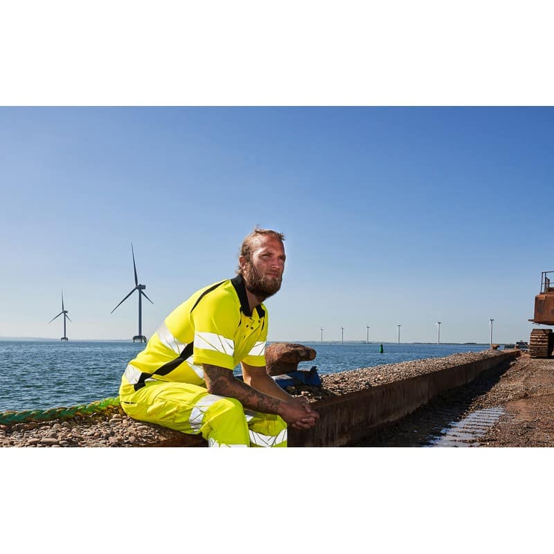 Premium. Fluorescerend, met schuine reflectie. Tweekleurig. Moderne pasvorm. Comfortabel katoen aan de binnenkant en duurzaam polyester met stretch aan de buitenkant. Vierkant jacquardpatroon. Elastische reflectieband. Tricot kraag. Sluiting met verborgen knopen. Verstevigde boord.