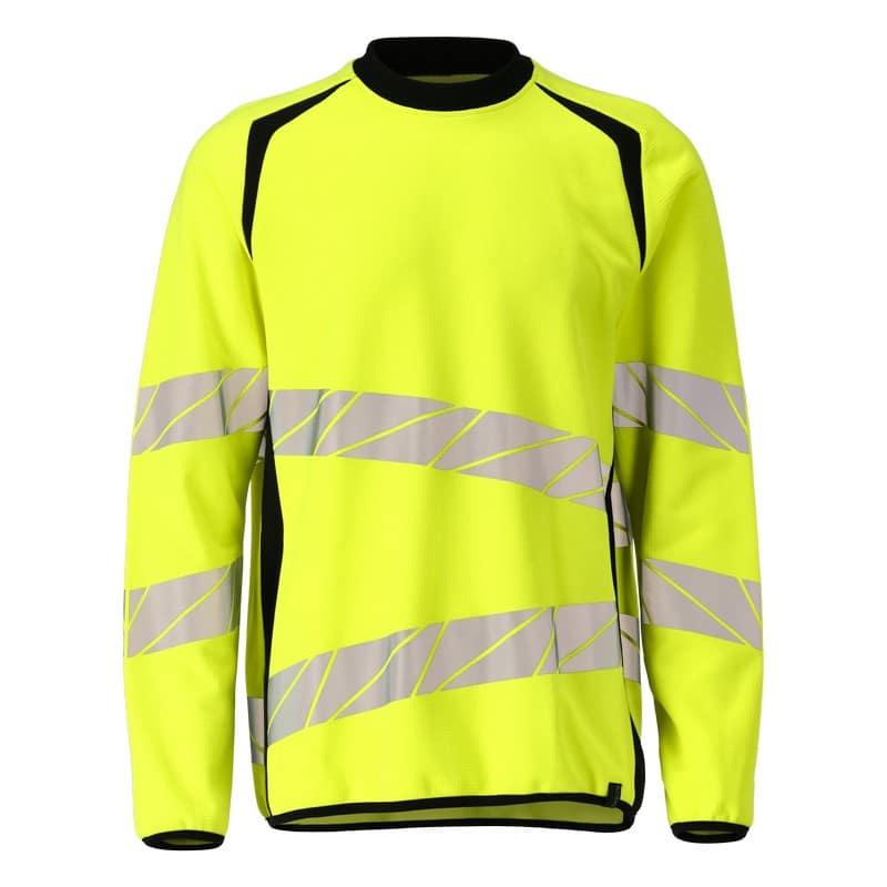 Mascot Accelerate Safe signalisatiesweater. Premium. Fluorescerend, met schuine reflectie. Tweekleurig. Moderne pasvorm. Comfortabel katoen aan de binnenkant en duurzaam polyester met stretch aan de buitenkant. Vierkant jacquardpatroon. Elastische reflectieband. Ronde hals. Tricot aan de hals. Versteviging in de nek. Verstevigde boord. Elastiekband bij de pols en aan de onderkant.