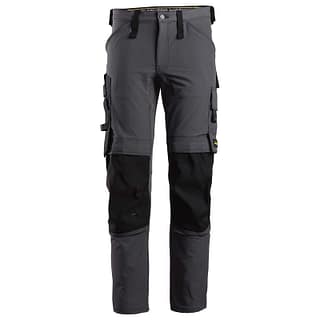 Snickers 6371 AllroundWork werkbroek. 4-weg stretchmateriaal. Stretch CORDURA op de knieën. CORDURA gereedschaphouders. Duimstokzak met mesbevestiging. Cargo-zak met ID-kaartbevestiging.