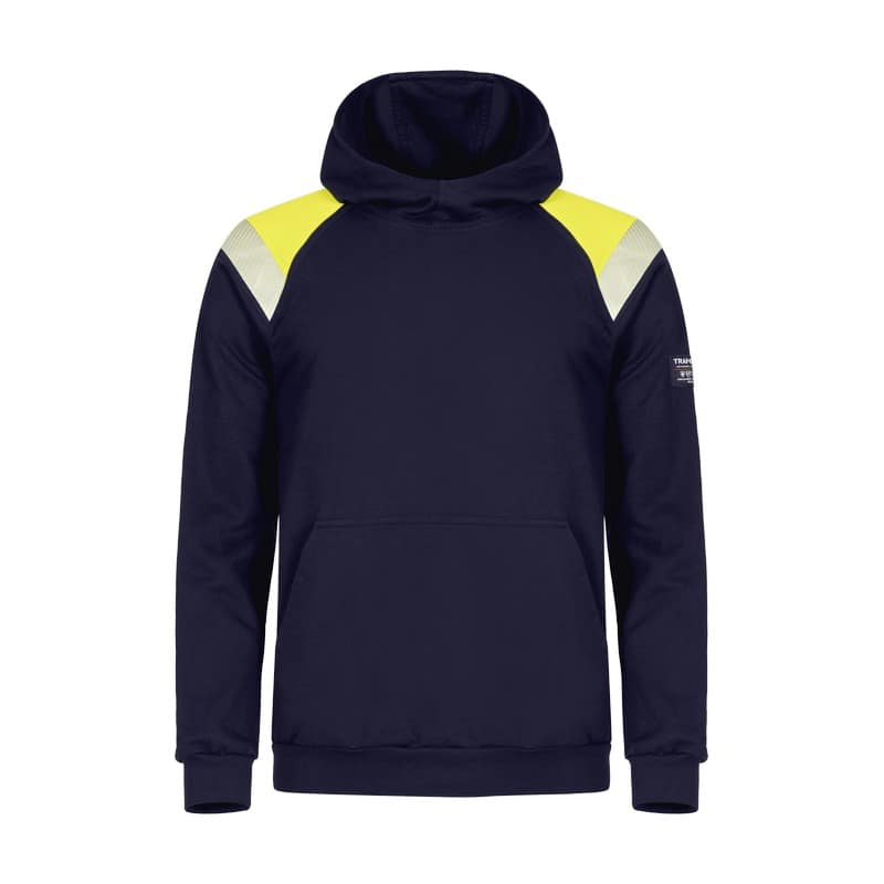 Tranemo Skinsafe vlamvertragende hoodie. Inherent vlamvertragende hoodie. Hi-Vis accenten op de schouders. Geribde manchetten. Met heat seal reflectie. 50% van het katoen is gemaakt van gerecycleerde katoen.