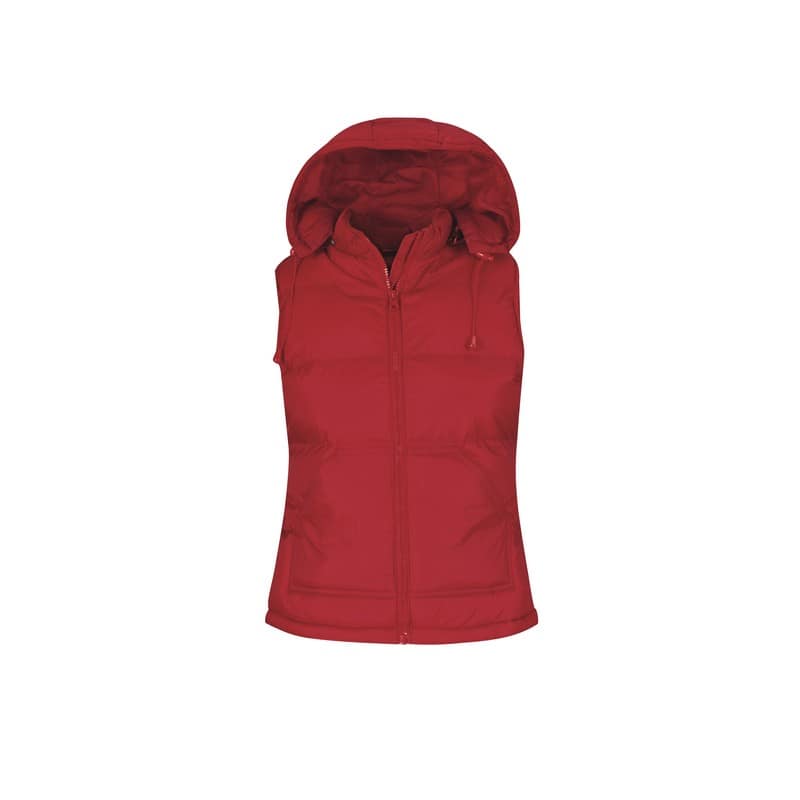 Trendy bodywarmer voor dames. Waterafstotend. Ritssluiting. 2 buitenzakken. Rechtstaande kraag met fleece aan binnenzijde. Middendeel rugpand zonder naden zodat er ook een groot logo op kan gezet worden. Afneembare en verstelbare kap. Elastische aantrekkoord met stoppers in onderboord.