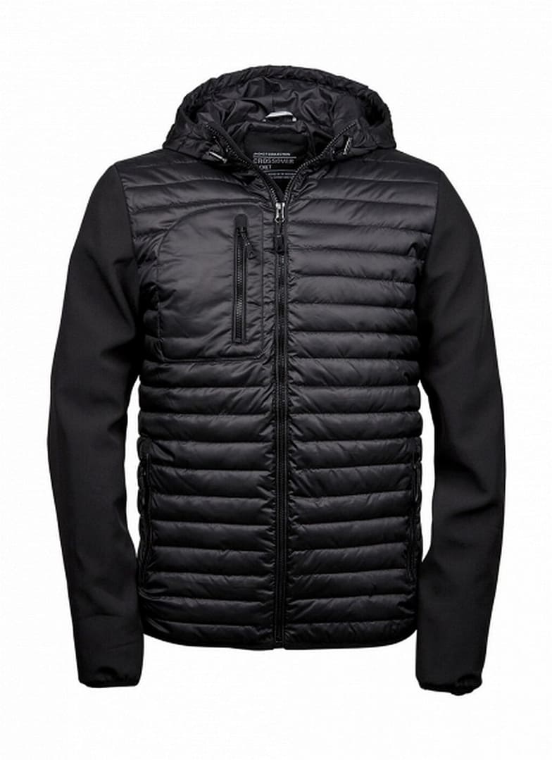 Teejays Crossover vest. Waterafstotend en ademend. Verstelbare kap. Volledige rits. 2 grote zakken aan de voorkant, borstzak en binnenzak. Elastische manchetten. Contrastdelen en mouwen in softshell.