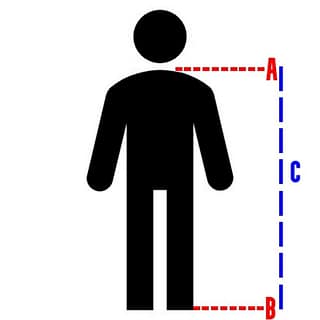 Maatinfo (maat/lengte/leeftijd)=6XS/112/6-7, 5XS/120/8, 4XS/128/9, XXXS/136/10-11, XXS/144/12, XS/152/13-14 De lengte (afstand C) is van onder gemeten (punt B) tot net bovenaan de schouders (punt A). Vb. als de lengte (afstand C) 120 cm is, dan kindermaat 5XS nemen.